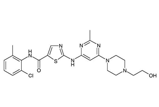 Dasatinib is supplied as a lyophilized powder. For a 5 mM stock, reconstitute the 5 mg in 2.05 mL DMSO. Working concentrations and length of treatments vary depending on the desired effect, but it is typically used at 50-500 nM for 2-6 hours. Soluble in DMSO at 200 mg/mL; very poorly soluble in ethanol and water with maximum solubility in water estimated to be about 10 μM.