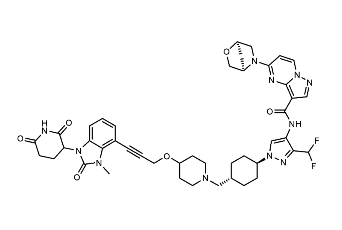 KT-474, also known as KYM-001, is a potent and selective degrader of interleukin-1 receptor-associated kinase 4 (IRAK4) (1). IRAK4 is a key protein involved in the interleukin-1 receptor (IL-1R)/toll-like receptor (TLR) signaling pathway (1-3). The IL-1R/TLR pathway is implicated in the pathogenesis of multiple inflammatory and autoimmune conditions, including hidradenitis suppurativa (HS), psoriasis, and atopic dermatitis (AD) (1,2). By targeting and degrading IRAK4, KT-474 effectively blocks the downstream inflammatory cascade triggered by the IL-1R/TLR pathway, reducing inflammation (1,2). In clinical trials, KT-474 reduced disease-relevant inflammatory biomarkers in the blood and skin samples of HS and AD patients and was associated with improvements in skin lesions (2,3).