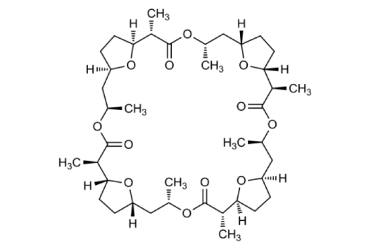 The antibiotic Nonactin is an ionophore that binds and transports monovalent cations (e.g., K+, NH4+, and Na+) across membranes through passive diffusion (1). Nonactin displays both antibacterial and anti-tumor activities, and inhibits drug efflux in multiple drug resistant cancers (2). Naturally occurring Nonactin is composed of four monomers of Nonactic acid, comprised of an equal number of (+) and (-) monomers. The antibiotic properties of Nonactin result from its ability to form stable complexes with monovalent cations; artificial Nonactin tetramers, comprised of either all (+) or all (-) Nonactic acid monomers, lack ion binding ability and are less potent antibiotics (3). Treatment of erythrocytes with Nonactin leads to suicidal erythrocyte death as evidenced by the shrinking of erythrocytes and translocation of phosphatidylserine from the erythrocyte interior to the cell surface (4). Nonactin selectively induces apoptosis and results in tumor regression in a β-catenin mutant HCT 116 xenograft model (5), and can inhibit the surface expression of endogenous HSP60 (6).