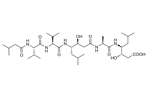 Pepstatin A is a low molecular weight inhibitor of aspartyl proteases, including pepsin, renin, cathepsin D and cathepsin E (1). Cathepsin D is a ubiquitously expressed lysosomal aspartyl protease involved in the normal degradation of proteins; dysregulation of cathepsin D plays a role in neuronal degradation and malignant transformation. Cathespin D is highly expressed in triple-negative breast cancer (TNBC) cells. Pepstatin A treatment induced apoptosis and autophagy while reducing the proliferation, invasion, and migration of TNBC cells (2). Increased expression and leakage of lysosomal cathepsin D is associated with cardiomyocyte death related to hyperglycemia. Treatment with Pepstatin A markedly diminished high glucose-induced cardiomyocyte death (3). Pepstatin A treatment of osteoclast cells suppressed receptor activator of NF-κB ligand (RANKL)-induced differentiation to mononuclear osteoclast cells by blocking NFATc1 expression and inhibiting ERK signaling (4). Pepstatin A also inhibits human immunodeficiency virus (HIV) protease (5). Pepstatin A treatment of HIV-infected H9 cells decreased the level of HIV core antigen in the culture medium (6).