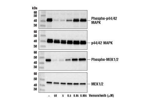Vemurafenib, also known as PLX4032, is an inhibitor of mutated BRAF (V600E) (1,2). The BRAF kinase is responsible for the activation of MEK and in turn, activating ERK and other downstream transcription factors involved in cell differentiation, proliferation, growth and apoptosis (1). The V600E mutation elevates the catalytic activity of BRAF which in turn renders it insensitive to negative feedback, thus causing hyperactivation of ERK signaling (2). Ultimately, the inhibition of mutated BRAF will cause a cascade of inhibitory actions against downstream targets, such as ERK and MEK1/2 (1,2).