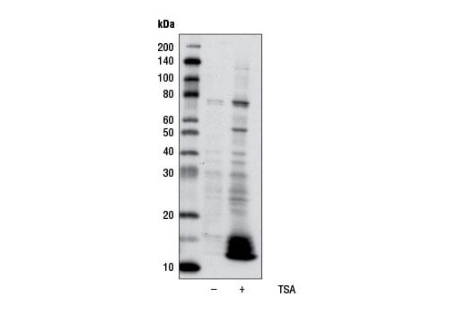 This Cell Signaling Technology® antibody is conjugated by the covalent reaction of hydrazinonicotinamide-modified antibody with formylbenzamide-modified horseradish peroxidase (HRP). The HRP conjugated antibody is expected to exhibit the same species cross-reactivity as the unconjugated Acetylated-Lysine (Ac-K-100) MultiMab® Rabbit mAb mix (HRP Conjugate) #9814.