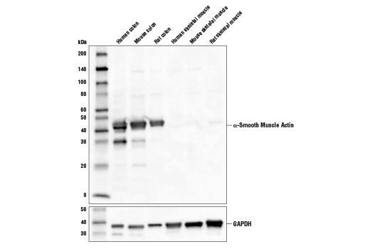 This Cell Signaling Technology antibody is conjugated to the carbohydrate groups of horseradish peroxidase (HRP) via its amine groups. The HRP conjugated antibody is expected to exhibit the same species cross-reactivity as the unconjugated α-Smooth Muscle Actin (D4K9N) XP® Rabbit mAb #19245.