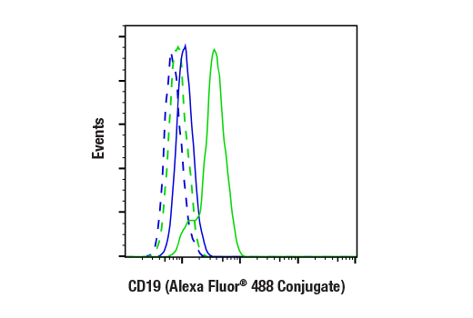 This Cell Signaling Technology antibody is conjugated to Alexa Fluor® 488 fluorescent dye and tested in-house for direct flow cytometric analysis in human and mouse cells. This antibody is expected to exhibit the same species cross-reactivity as the unconjugated CD19 (D4V4B) XP® Rabbit mAb #90176.