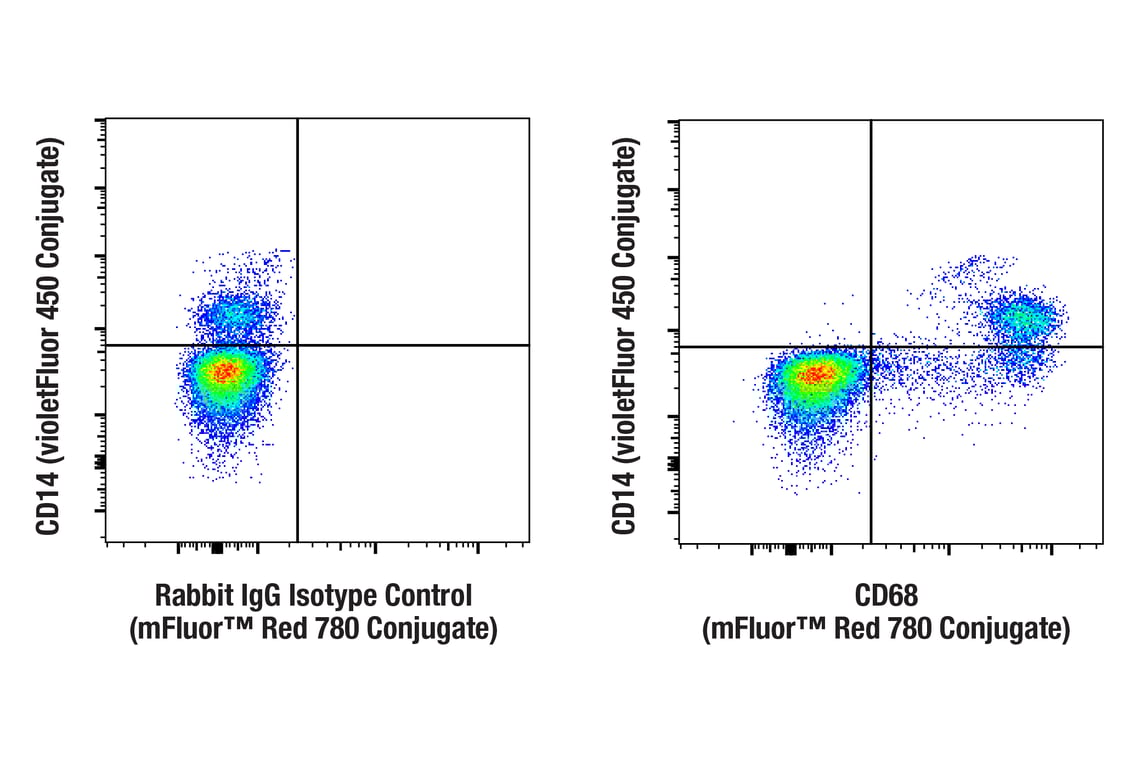 This Cell Signaling Technology® antibody is conjugated to mFluor™ Red 780 fluorescent dye under optimal conditions. This antibody conjugate is expected to exhibit the same species cross-reactivity as the unconjugated CD68 (D4B9C) XP® Rabbit mAb #76437.