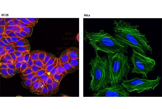 This Cell Signaling Technology antibody is conjugated to Alexa Fluor® 594 fluorescent dye and tested in-house for direct immunofluorescent analysis in human cells. The antibody is expected to exhibit the same species cross-reactivity as the unconjugated EpCAM (VU1D9) Mouse mAb #2929.