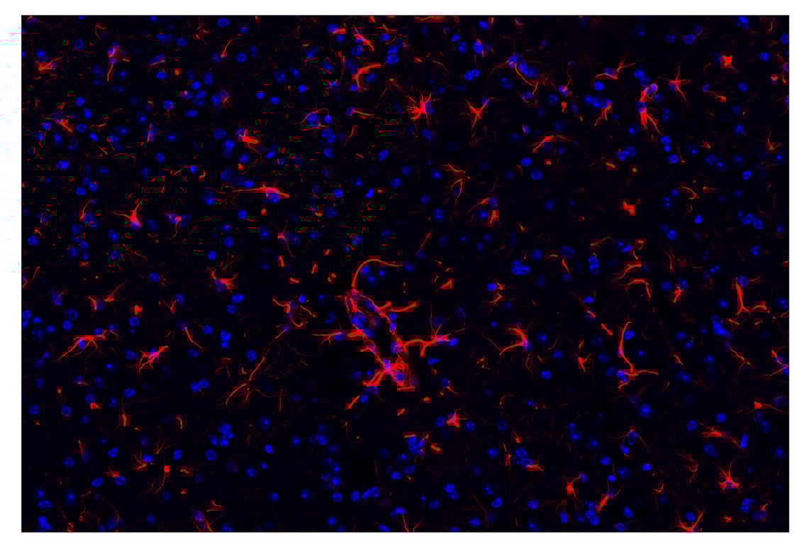 This Cell Signaling Technology® antibody is conjugated to Alexa Fluor® 555 fluorescent dye under optimal conditions. This antibody conjugate is expected to exhibit the same species cross-reactivity as the unconjugated GFAP (E4L7M) XP® Rabbit mAb #80788.