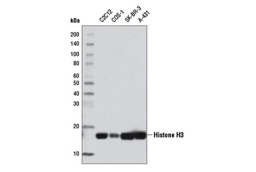 Histone H3 (D1H2) XP® Rabbit mAb (HRP Conjugate) detects endogenous levels of total Histone H3 protein, including isoforms H3.1, H3.2, and H3.3. This antibody conjugate also detects the Histone H3 variant CENP-A. This antibody conjugate does not cross-react with other core histones.