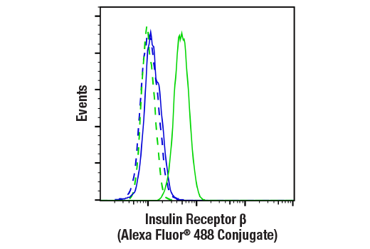 This Cell Signaling Technology antibody is conjugated to Alexa Fluor® 488 fluorescent dye under optimal conditions and tested in-house for direct flow cytometric analysis in human cells. This antibody conjugate is expected to exhibit the same species cross-reactivity as the unconjugated Insulin Receptor β (E9L5V) XP® Rabbit mAb #23413.
