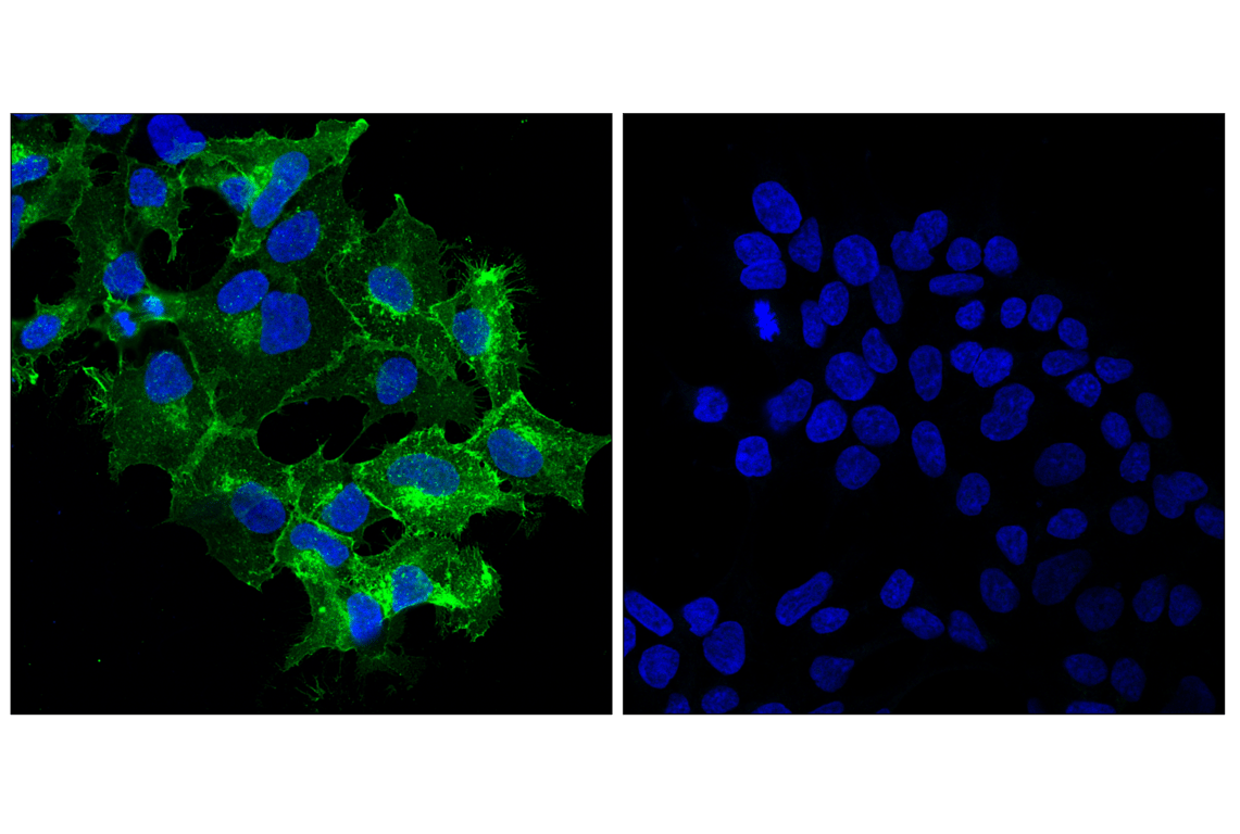 Myc-Tag (71D10) Rabbit Monoclonal Antibody (Alexa Fluor® 488 Conjugate) detects recombinant proteins containing the Myc epitope tag. This antibody conjugate recognizes the Myc-tag fused to either the amino or carboxy terminus of targeted proteins in transfected cells. This antibody conjugate may cross-react with c-myc protein by Flow Cytometry and Immunofluorescence assays.