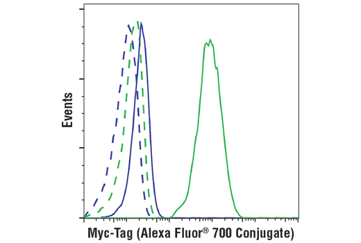 This Cell Signaling Technology antibody is conjugated to Alexa Fluor® 700 fluorescent dye and tested in-house for direct flow cytometry analysis in human cells transfected with Myc-tagged protein.