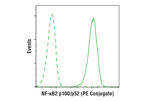 This Cell Signaling Technology antibody is conjugated to phycoerythrin (PE) and tested in-house for direct flow cytometry analysis in human cells. The antibody is expected to exhibit the same species cross-reactivity as the unconjugated NF-κB2 p100/p52 (18D10) Rabbit mAb #3017.