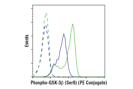 This Cell Signaling Technology antibody is conjugated to phycoerythrin (PE) and tested in-house for direct flow cytometry analysis in mouse cells. The antibody is expected to exhibit the same species cross-reactivity as the unconjugated Phospho-GSK-3β (Ser9) (D85E12) XP® Rabbit mAb #5558.
