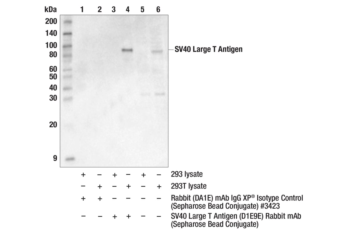 SV40 Large T Antigen (D1E9E) Rabbit mAb (Sepharose Bead Conjugate) is useful for immunoprecipitation assays. The antibody is expected to exhibit the same cross-species reactivity as the unconjugated SV40 Large T Antigen (D1E9E) Rabbit mAb #15729.