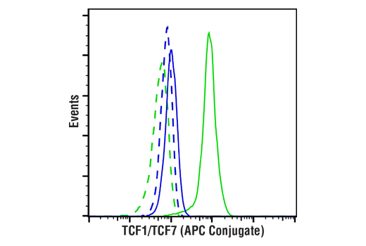 TCF1/TCF7 (C63D9) Rabbit mAb (APC Conjugate) detects endogenous levels of total TCF1/TCF7 protein. This antibody conjugate does not recognize the dominant negative isoforms of TCF1/TCF7 lacking the amino-terminal β-catenin binding domain and does not cross-react with LEF1.