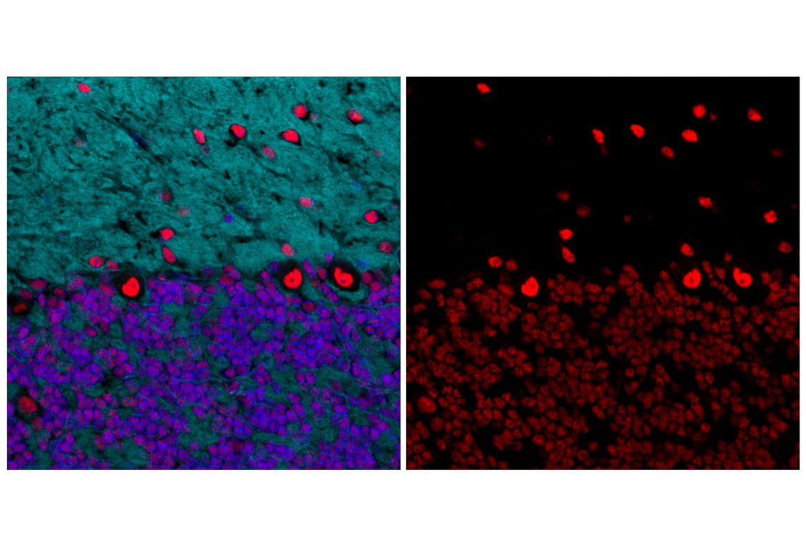 This Cell Signaling Technology antibody is conjugated to Alexa Fluor® 555 fluorescent dye and tested in-house for direct immunofluorescent analysis in human cells and mouse tissue. This antibody is expected to exhibit the same species cross-reactivity as the unconjugated TDP43 (D9R3L) Rabbit mAb #89789.