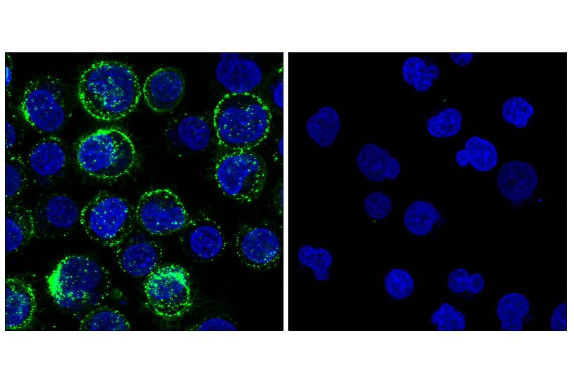 This Cell Signaling Technology antibody is conjugated to Alexa Fluor® 488 fluorescent dye under optimal conditions and tested in-house for direct flow cytometric analysis in human cells. This antibody conjugate is expected to exhibit the same reactivity as the unconjugated Whitlow/218 Linker (E3U7Q) Rabbit mAb #57710, which is expected to react with cell surface expressed CARs of varying specificity containing a Whitlow/218 linker within the scFv of the extracellular domain.
