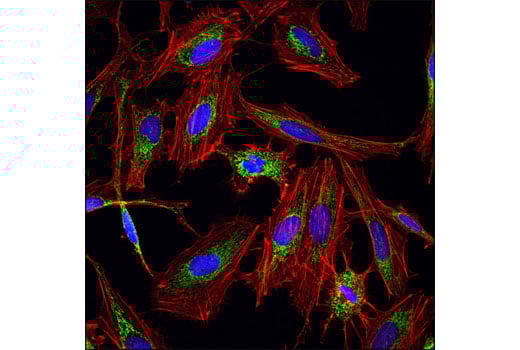 To make a 100X stock, reconstitute the lyophilized material in 100 µl anhydrous DMSO. Fix cells for 15 minutes using fresh, methanol-free 4% formaldehyde, then rinse three times in PBS for 5 minutes each. Once fixed, please follow CST protocol for immunostaining. Following incubation of the primary and secondary antibodies, Alexa Fluor® 555 Phalloidin can be diluted 1:100 (1 μl per 100 μl assay volume) in PBS and added to the cells. Allow to incubate for 15 minutes at room temperature, then rinse once with PBS. Coverslip slides with ProLong Gold Antifade Reagent and examine specimen using appropriate excitation wavelength.
