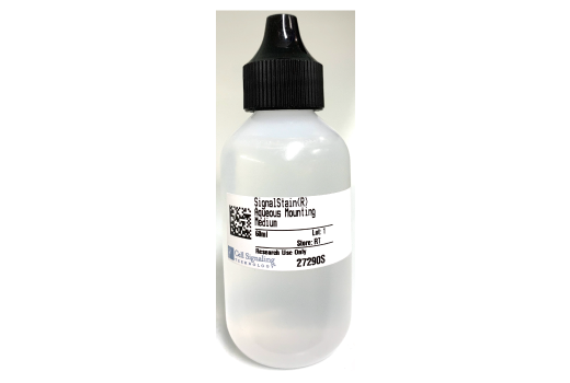 b. Add 1 or 2 drops of SignalStain® Aqueous Mounting Medium #27290 on the stained section. When the coverslip is applied, the medium will spread evenly across the coverslipped area and will dry completely. Sections may be viewed immediately, but it will take approximately 10-15 minutes for the coverslip to become immobilized and several hours to be completely hardened.
