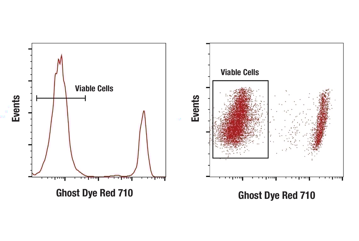 Ghost Dye Red 710 Fixable Viability Dye is used to discriminate viable from non-viable mammalian cells in flow cytometry applications. Ghost Dye Red 710 Fixable Viability Dye irreversibly binds free amines available on the cell surface as well as intracellular free amines exposed in cells with compromised cell membranes. Non-viable cells with loss of membrane integrity will be labeled with significantly more dye than healthy cells in the same sample. The cells may then be fixed, and the degree of labeling will be preserved through fixation, permeabilization, and antibody incubation steps. Cells that exhibit increased fluorescence intensity were non-viable at the time of fixation and can be excluded from analysis.