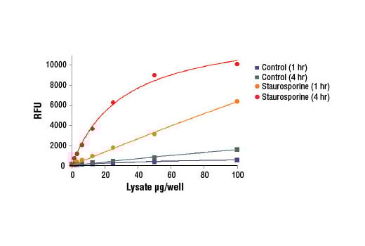 Caspase-3 Activity Assay Kit detects fluorescent AMC dye produced from cleavage of Ac-DEVD-AMC by activated caspase-3 in apoptotic cells. This kit is expected to work in most species. Depending on the cell type and the incubation time applied in the assay, 0.5 - 2x105 cells/well (or 100 μg/well of total lysate protein) is sufficient for most experimental setups. For best results, cell number or lysate concentration titrations are recommended (see Figures 1 and 2). Because caspase-7 shares the same susbtrate sequence as caspase-3, this kit also detects caspase-7 activity.