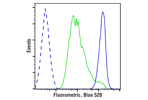 The Cell Proliferation Tracer Kit (Fluorometric, Blue 520) contains Cell Proliferation Tracer Dye, Blue 520 that diffuses passively into live cells and is used for long-term cell labeling. This dye is initially a non-fluorescent ester, but is converted to a fluorescent dye by intracellular esterases. The dye then covalently reacts with amine groups on proteins, forming fluorescent conjugates that are retained in the cell. Immediately after staining, a single, bright fluorescent population will be detected by flow cytometry. Each cell division that occurs after labeling results in the appearance of a dimmer fluorescent peak on a flow cytometry histogram. The Cell Proliferation Tracer Kit (Fluorometric, Blue 520) can be used to track cell divisions in vivo or in vitro. Staining can withstand fixation and permeabilization for subsequent immunostaining.
