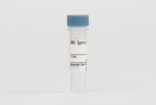100X Spermidine is offered to conveniently provide additional spermidine for use with the CUT&RUN Assay Kit #86652 or the CUT&Tag Assay Kit #77552. Both CUT&RUN Assay Kit #86652 and CUT&Tag Assay Kit #77552 provide all the reagents required for performing the recommended number of Cleavage Under Targets & Release Using Nuclease (CUT&RUN) and Cleavage Under Targets & Tagmentation (CUT&Tag) assays. However, there are instances where extra spermidine is desired. This product can be added to the Antibody Binding Buffer (CUT&RUN, CUT&Tag) #15338 or 10X Wash Buffer (CUT&RUN, CUT&Tag) #31415 right before use, or be used in other assays as needed. Please keep on ice during use and store at -20°C when finished for the day.