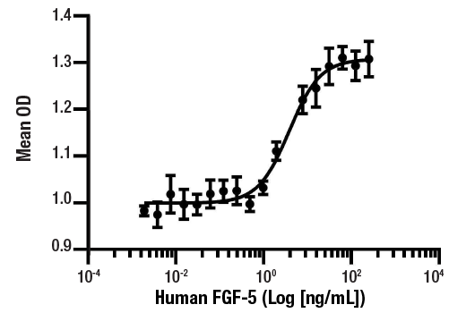 | Activity | The bioactivity of recombinant hFGF-5 was determined in an NR6R-3T3 cell proliferation assay. The ED50 of each lot is less than or equal to 10 ng/mL. |