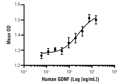 Glial cell-derived neurotrophic factor (GDNF) plays an important role in the development and maintenance of the central and peripheral nervous system, renal morphogenesis, and spermatogenesis (1). This glycosylated, disulfide-bonded homodimer is a member of the TGF-β superfamily and plays an important role in neuronal survival (2). GDNF and the related GDNF family of ligands (GFLs) neurturin, persephin, and artemin bind to the GDNF family receptor α (GFRα) proteins that signal through the Ret receptor tyrosine kinase (3,4). The effect that GDNF has on degenerating dopamine neurons makes it an important growth factor when studying Parkinson’s disease (PD) (5). GDNF has also been identified as a therapeutic target for amyotrophic lateral sclerosis (ALS), is a suggested biomarker for Alzheimer’s Disease (AD), and has been associated with cancer progression (6-9).