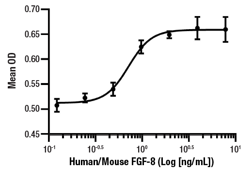 | Activity | The bioactivity of recombinant h/mFGF-8 was determined in an NR6R-3T3 cell proliferation assay. The ED50 of each lot is less than or equal to 150 ng/mL. |