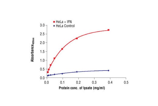 CST's PathScan® Phospho-Stat3 (Tyr705) Sandwich ELISA Antibody Pair is offered as an economical alternative to our PathScan® Phospho-Stat3 (Tyr705) Sandwich ELISA Kit #7300. Capture and Detection antibodies (100X stock) and HRP-Linked Secondary Antibody (1000X stock) are supplied. Sufficient reagents are supplied for 4 x 96 well ELISAs. The Stat3 Rabbit Capture Antibody is coated in PBS overnight in a 96 well microplate. After blocking, cell lysates are added, followed by Phospho-Stat3 (Tyr705) Mouse Detection Antibody and HRP-Linked Anti-Mouse IgG. HRP substrate, TMB, is added for color development. The magnitude of the absorbance for this developed color is proportional to the quantity of phospho-Stat3 (Tyr705) protein.