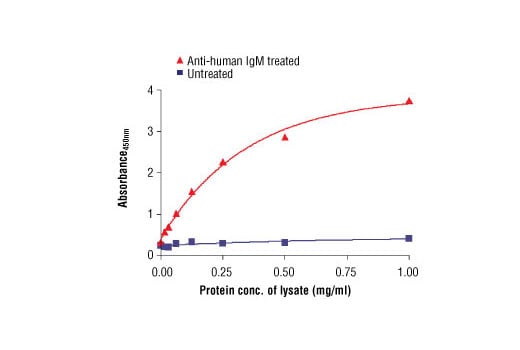CST's PathScan® Phospho-Syk (panTyr) Sandwich ELISA Antibody Pair is being offered as an economical alternative to our PathScan® Phospho-Syk (panTyr) Sandwich ELISA Kit #7928. Capture and detection antibodies (100X stocks) and HRP-linked streptavidin (1000X stock) are supplied. Sufficient reagents are supplied for 4 x 96 well ELISAs. The Syk mouse capture antibody is coated in PBS overnight in a 96 well microplate. After blocking, cell lysates are added followed by biotinylated phospho-tyrosine mouse detection antibody and HRP-linked streptavidin. HRP substrate (TMB) is added for color development. The magnitude of the absorbance for this developed color is proportional to the quantity of Syk phosphorylated on tyrosines.