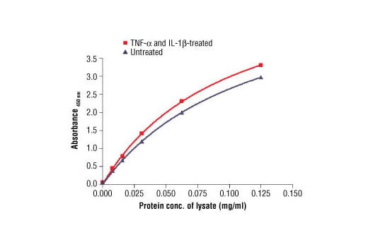 CST's PathScan® Total NF-κB p65 Sandwich ELISA Antibody Pair is offered as an economical alternative to our PathScan® Total NF-κB p65 Sandwich ELISA Kit #7174. Capture and Detection antibodies (100X stocks) and HRP-conjugated secondary antibody (1000X stock) are supplied. Sufficient reagents are supplied for 4 x 96 well ELISAs. The NF-κB p65 Capture Antibody is coated in PBS overnight in a 96 well microplate. After blocking, cell lysates are added followed by a NF-κB p65 Detection Antibody and anti-Mouse IgG, HRP conjugated antibody. HRP substrate, TMB, is added for color development. The magnitude of the absorbance for this developed color is proportional to the quantity of total NF-κB p65 protein.