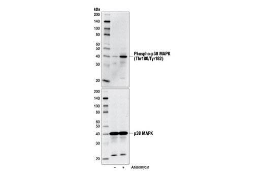 Boil for 3 minutes prior to use. Load 15 µl of phosphorylated and nonphosphorylated p38 MAPK Control Cell Extracts per lane.