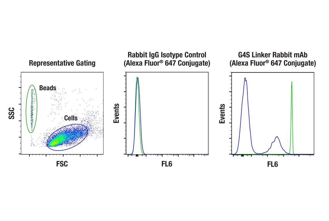 Posibeads™ provide a unique positive control to confirm specific binding and fluorescence of your antibody conjugate of interest. Posibeads™ behave like cells in suspension, and can be carried through immunostaining and wash steps following the same procedure as your cell-based samples. The 5 nm non-fluorescent polystyrene beads are coated with G4S linker peptide. When incubated in the presence of a fluorescent antibody conjugate targeting G4S linker, the antibody will bind to the beads and result in increased fluorescence relative to unlabeled beads. Unlike compensation beads, the binding is driven by the antibody specifically targeting its antigen. Because of this, these Posibeads™ can be used as a specific control for a G4S linker antibody even when tested as part of a panel of other conjugated antibodies.