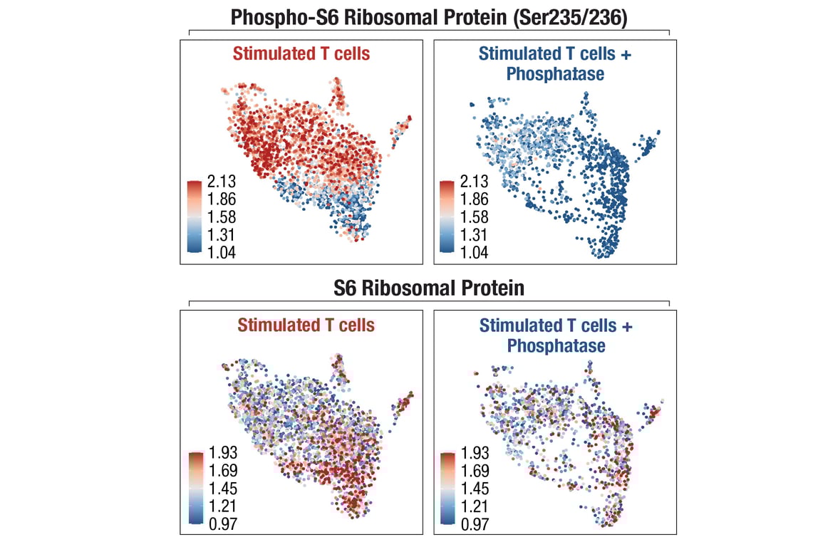 Phospho-S6 Ribosomal Protein (Ser235/236) (D57.2.2E) Rabbit Monoclonal Antibody (InTraSeq™ 3' Conjugate 3019) detects endogenous levels of ribosomal protein S6 only when phosphorylated at Ser235 and 236. Non-specific labeling in pancreatic islets has been observed by immunofluorescence in fixed frozen mouse tissue post-processed with λ phosphatase.