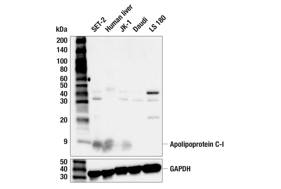 Apolipoprotein C-I (F9L6S) Rabbit Monoclonal Antibody recognizes endogenous levels of total apolipoprotein C-I protein. This antibody detects a 35 kDa and a 45 kDa protein of unknown identity in some cell lines.