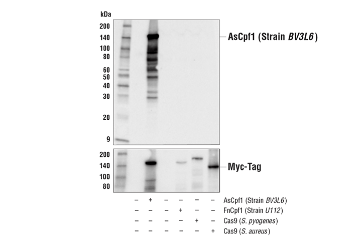 AsCpf1/Cas12a (Strain BV3L6) (3D3-F7) Mouse Monoclonal Antibody recognizes transfected levels of total AsCpf1/Cas12a (Strain BV3L6) protein. This antibody does not cross-react with Cas9 (S. pyogenes), Cas9 (S. aureus), or FnCpf1/Cas12a (Strain U112) proteins.