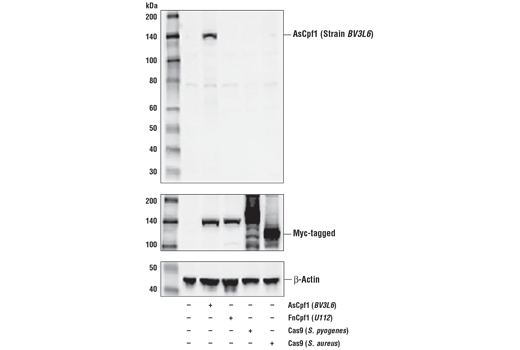 AsCpf1/Cas12a (Strain BV3L6) Antibody recognizes transfected levels of total AsCpf1/Cas12a (Strain BV3L6) protein. This antibody does not cross-react with Cas9 (S. pyogenes), Cas9 (S. aureus), and FnCpf1/Cas12a (Strain U112) proteins.