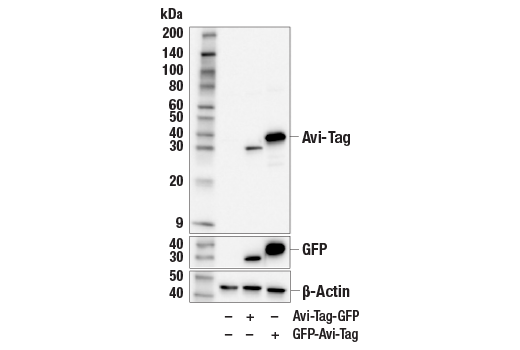 Avi-Tag Antibody detects exogenously expressed proteins containing the Avi epitope tag. This antibody recognizes the Avi tag fused to either the amino or carboxy terminus of targeted proteins in transfected cells. This antibody detects exogenously expressed avi-tagged proteins in cells expressed under a CMV promoter. Expression under other promoters has not been evaluated.