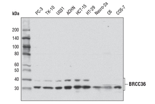 BRCC36 (D5E5H) Rabbit mAb recognizes endogenous levels of total BRCC36 protein. This antibody detects BRCC36 isoform1 and BRCC36 isoform2.