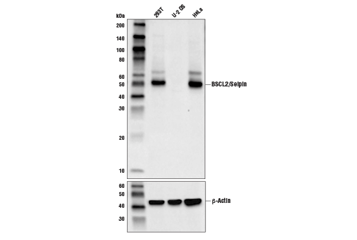 BSCL2/Seipin (D3W8C) Rabbit Monoclonal Antibody recognizes endogenous levels of total BSCL2/Seipin protein.