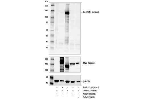 Cas9 (S. aureus) Antibody recognizes transfected Cas9 (S. Aureus) protein. This antibody does not cross-react with Cas9 (S. pyogenes), AsCpf1 (Strain BV3L6), and FnCpf (Strain U112).