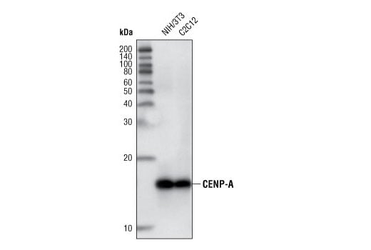 CENP-A (C5H3) Rabbit Monoclonal Antibody detects endogenous levels of total mouse CENP-A protein. This antibody does not cross-react with other histone proteins, including Histone H3.