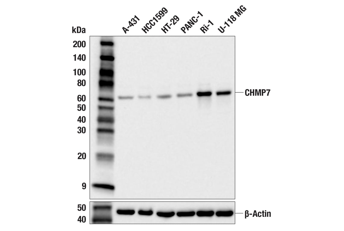 Charged multivesicular body protein 7 (CHMP7) is a part of the endosomal sorting complex required for transport-III (ESCRT-III) (1,2). CHMP7 is typically found in the cytoplasm under homeostatic conditions, but it continually diffuses into the nucleus (1,2). To prevent accumulation, it is then actively exported back to the cytoplasm by exportin-1 (1,2). Upon completion of mitosis, CHMP7 helps to reform the nuclear envelope (3). CHMP7 can also regulate interactions between the endoplasmic reticulum and mitochondria (3). Micronuclei, often present in cancer cells with chromosomal instability, can be disrupted by CHMP7 accumulation and oligomerization, which occurs with increased intracellular reactive oxygen species (4). CHMP7 is also involved in amyotrophic lateral sclerosis (ALS) and may be a therapeutic target. Aberrant CHMP7 nuclear accumulation in neurons leads to nuclear pore damage and TDP-43 dysfunction (2,5).