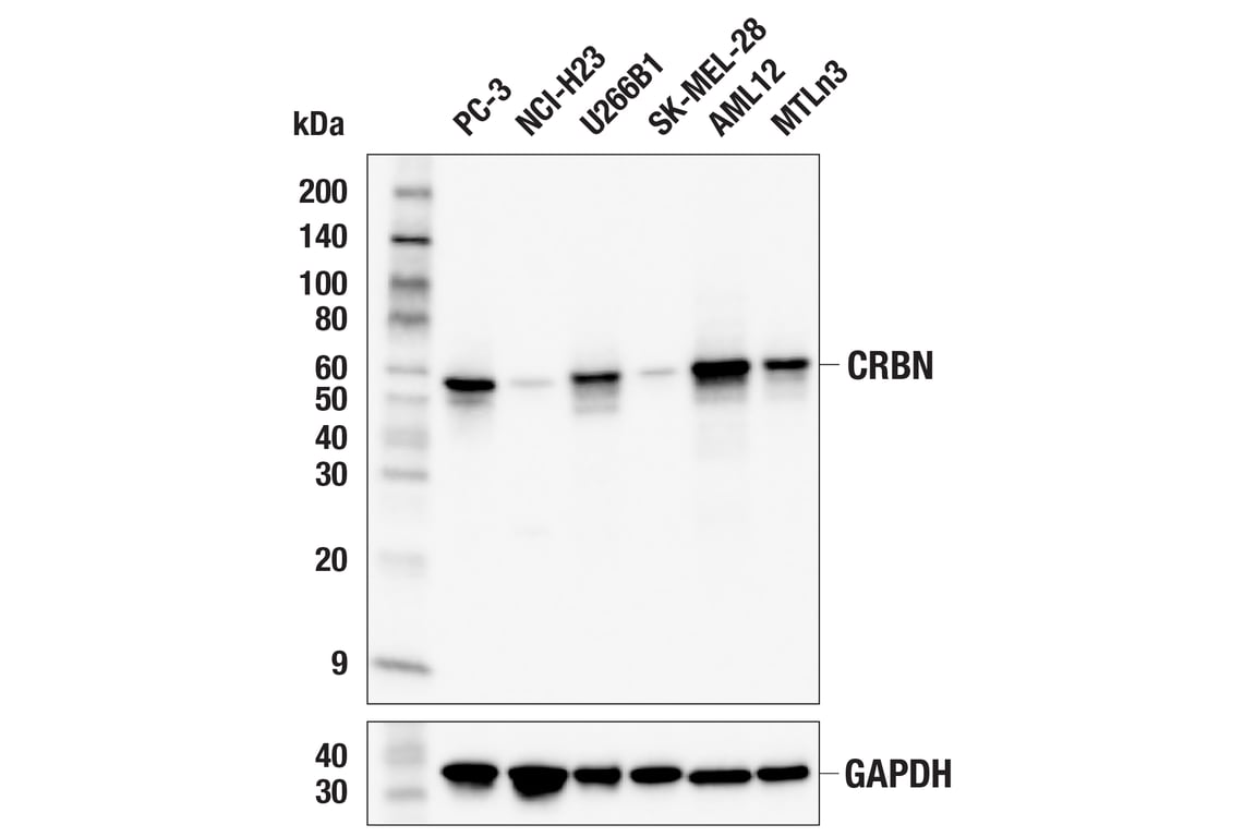 CRBN (F4I7F) Rabbit Monoclonal Antibody (BSA and Azide Free) recognizes endogenous levels of total CRBN protein.