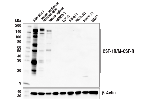 | MW (kDa) | 52 cytoplasmic domain. 140 precursor. 175 M-CSF Receptor. |