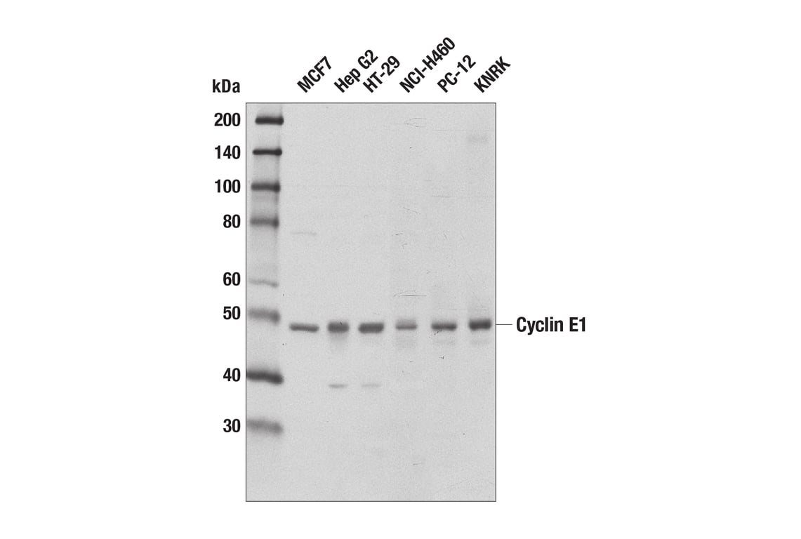 Cyclin E1 (D7T3U) Rabbit Monoclonal Antibody recognizes endogenous levels of total cyclin E1 protein. Based on the sequence of the peptide antigen, this antibody is expected to detect all isoforms of cyclin E1. This antibody does not cross-react with cyclin E2.