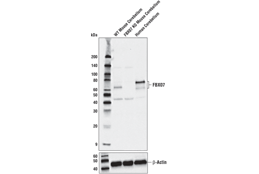 FBXO7 (D8L4E) Rabbit Monoclonal Antibody recognizes endogenous levels of total FBXO7 protein. This antibody detects two bands bands in human cerebellum, consistent with multiple FBXO7 isoforms generated by alternative splicing.