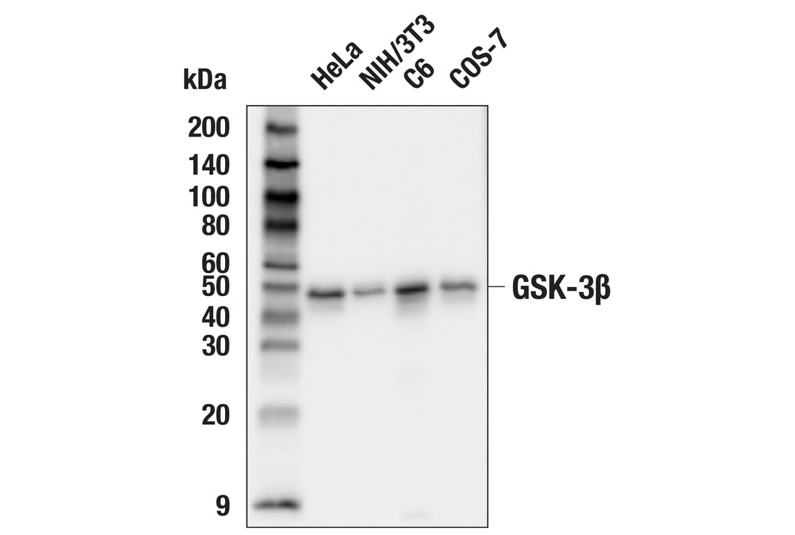 GSK-3β (27C10) Rabbit mAb detects endogenous levels of total GSK-3β protein.